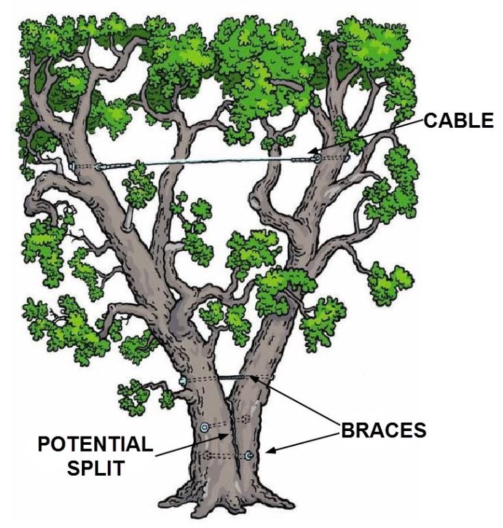 Tree support systems are used to provide supplemental support to leaders, individual branches and/or entire trees. Cables, braces, and guys all provide supplemental support by limiting the movement of the branches, leader, or entire trees. When a tree has a structural defect or condition that poses a high risk of failure, which may result in injury or property damage, a supplemental support system can often reduce this risk. Our Certified Arborists will carefully examine your trees for structural defects to determine if a cable and/or brace should be installed.
